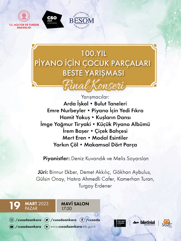 Çocuklar için bestelediğim “Piyano İçin 7 Fıkra” eseri BESOM Besteciler, Orkestra Şefleri ve Müzikologlar Derneği’nin Cumhuriyetin 100. yılı onuruna düzenlediği Piyano İçin Çocuk Parçaları beste yarışmasında ikincilik ödülüne layık görüldü.