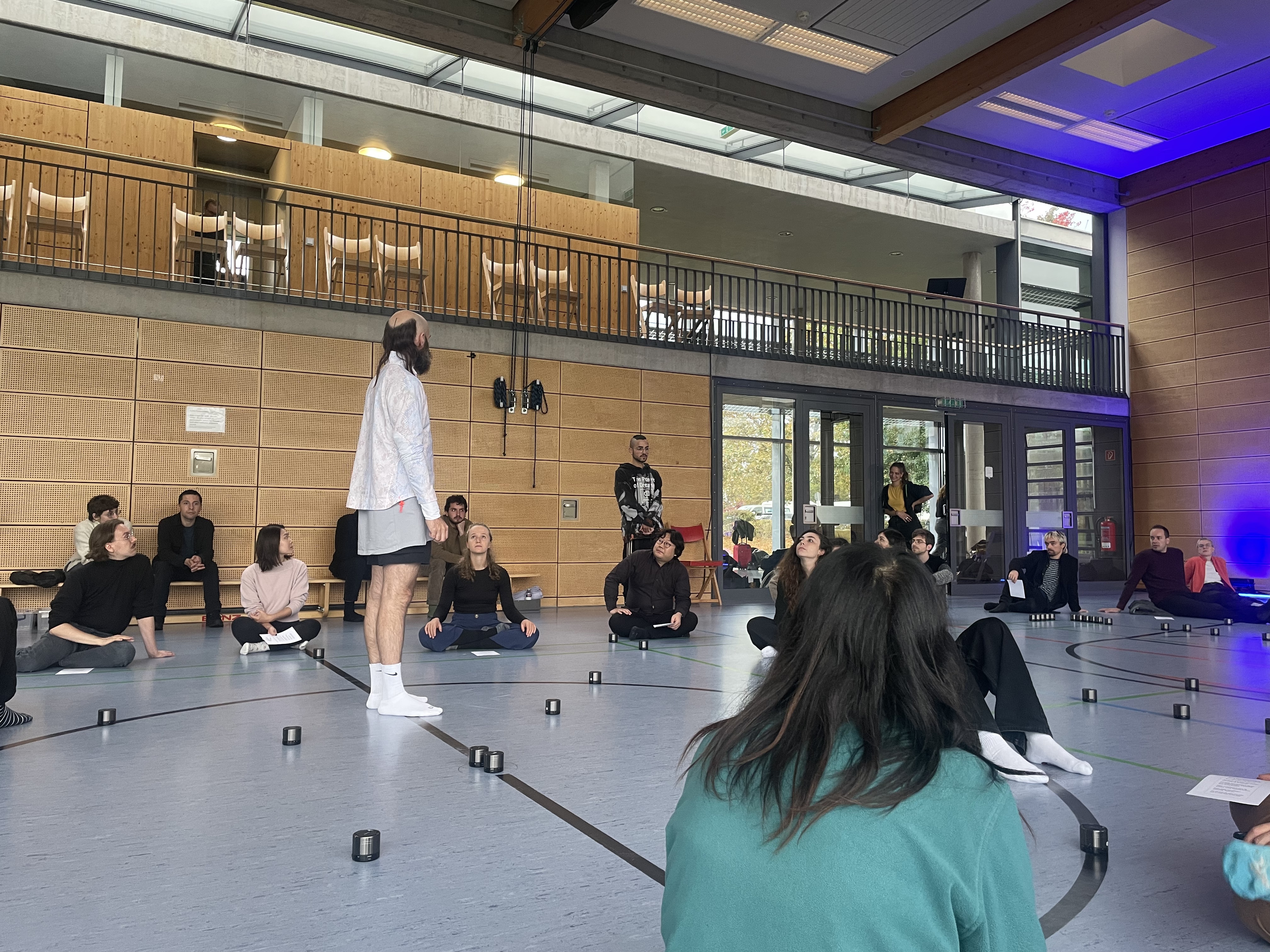 They each had numbers on them to identify, and the composer Blecharz (that’s the bald guy wearing white socks and sport outfit) acted as a performer by constantly moving the speakers as planned and initiating meditative, droning sounds from them, one by one, by hand, in a specifically planned manner. This was arguably the best way to synchronize 220 wireless speakers; by playing sounds that don’t need perfect synchronization to combine. He said in his instagram that he squatted 600 times in one day because of this performance!